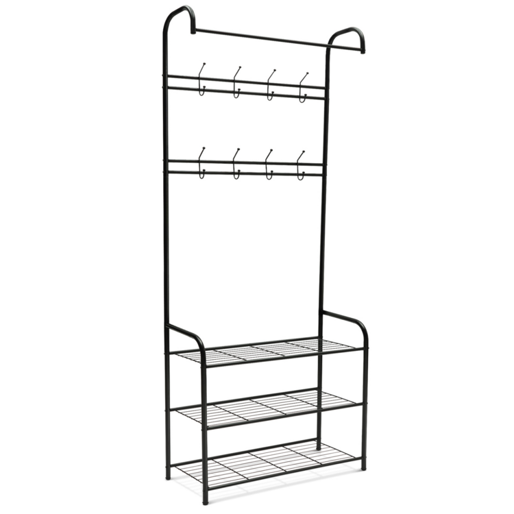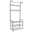 ID Market vous propose un portant en métal noir alliant les fonctions penderie et rangements, et qui apporte une petite touche industrielle à votre entrée !Son style moderne, contemporain et ses lignes sobres offriront à votre entrée un esprit factory !De quoi accueillir vos invités dans une ambiance ultra chaleureuse type loft, avec une entrée cosy et tendance !Esthétique, ce joli vestiaire d'entrée en métal noir PABLO trouvera idéalement sa place dans les intérieurs urbains et contemporains, mais aussi plus rustiques.La structure de cette penderie, en métal noir, lui apporte une vraie stabilité et une véritable solidité.Plus qu'un simple porte-manteaux, avec ses 8 patères doubles, ce vestiaire 2-en-1 est multifonctions. Les crochets arrondis sont spécialement conçus pour accrocher des accessoires et ne pas abîmer vos vêtements. Il offre trois grandes étagères de rangement pour une entrée organisée en toute occasion. Une barre de penderie complète le dressing.Astucieux et pratique, trouvez une place pour accrocher ou ranger discrètement vos clés, chausse-pieds et ne plus les chercher !Fonctionnel, rangez-y vos chaussures, sacs, paniers, boîtes de rangement pour ne plus rien laisser traîner dans le vestibule ou ajouter une touche déco à votre intérieur.Véritable gain de place, il apporte une réelle valeur ajoutée à votre entrée en la décorant et en la meublant sans l'alourdir en toute simplicité.Pratique, simple, efficace, pas cher ! Il remplit parfaitement sa fonction !Dimensions du portant métal PABLO - Dimensions globales hors tout : Longueur 71 CM x largeur 31 CM x Hauteur 186 CM- Dimensions des étagères à chaussures : L. 65 x l. 31 x H. 22 CM- Hauteur des pieds : 5 CM- À monter soi-mêmeRetrouvez tous nos vestiaires et meubles d'entrée disponibles sur notre boutique en ligne !