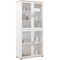 Ajoutez une touche d'élégance à votre intérieur grâce à notre armoire vitrine 4 portes VITO blanche et bois. Ce meuble allie modernité et tradition, offrant un espace de rangement fonctionnel tout en mettant en valeur vos objets décoratifs ! Les 4 placards offrent un accès facile à vos affaires tout en préservant un aspect soigné. Idéal pour le salon, la salle à manger ou même un bureau, ce buffet avec vitrine est parfait pour exposer votre collection de livres, de vaisselle ou de souvenirs de voyage tout en offrant un espace de rangement optimisé. Profitez d'un meuble totalement vitré pour optimiser le rangement dans votre pièce de vie tout en lui offrant un côté design, c'est un mix parfait entre style et praticité ! Sur la partie du haut, vous disposez de 2 étagères ajustables en hauteur tandis qu'une étagère ajustable est disponible sur la partie basse.Son design contemporain intemporel s'intègrera parfaitement dans tous les styles d'intérieur, du altique au moderne. Le coloris blanc mélangé aux planches de bois clair à chaque extrémité du vaisselier en font un meuble épuré et chic. N'hésitez plus et optez pour ce vaisselier avec vitrine VITO 4 portes blanc et bois pour un rangement optimisé et esthétique à prix mini ! Dimensions du buffet haut vitrine VITO blanc et boisDimensions globales : Longueur 80 cm x largeur 34 cm x Hauteur 176 cm Hauteur des pieds : 2,5 cmDimensions intérieures d'un placard : L. 77 x l. 32,5 x H. 85 cm 2 étagères ajustables en haut et 1 étagère ajustable en bas Dimensions des portes vitrées : L. 30,5 x H. 75 cmLargeur de l'encadrement autour des vitres : 4,5 cmLongueur d'une poignée : 11 cmMatériaux : panneaux de particules de bois (PB) et vitres en PVCColoris : blanc et boisÀ monter soi-même Cette armoire vitrine VITO blanc et bois existe également avec 2 portes vitrées.Pour une pièce de vie harmonieuse, craquez pour le meuble TV ou le buffet bas de la même collection par exemple !