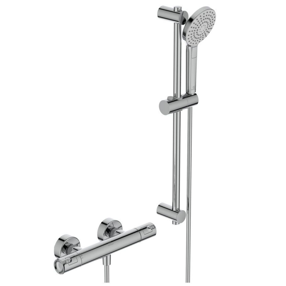 Vivez une expérience de douche révolutionnaire avec l'ensemble de douche mitigeur thermostatique Ceratherm T50 Ideal Standard. Cet ensemble de douche est composé de plusieurs éléments :Barre de douche métal 60 cm (A7217AA) ou 90 cm (A7218AA)Douchette ronde Idealrain EvoMitigeur thermostatique Cerath