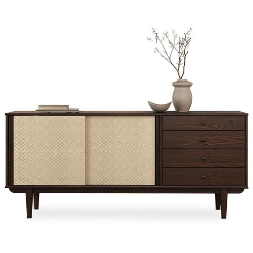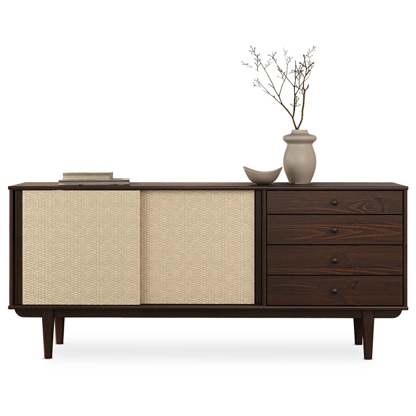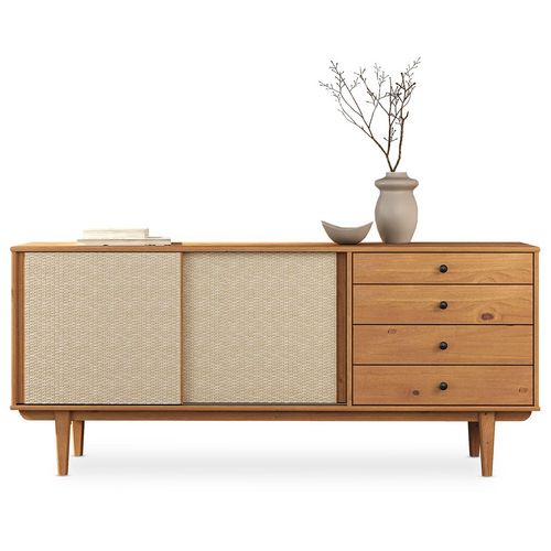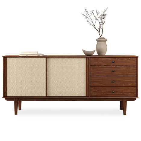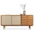 Apportez du charme vintage à votre intérieur avec le buffet Simona. Le meuble est pratique avec ses tiroirs et ses portes coulissantes, les portes tressées apportent une petite touche d'artisanat qui reste discrète et élégante. Il sera parfaitement à sa place dans un intérieur d'inspiration mid-century ou vintage années 50-60, que ce soit dans un salon, une salle à manger ou même une grande entrée.