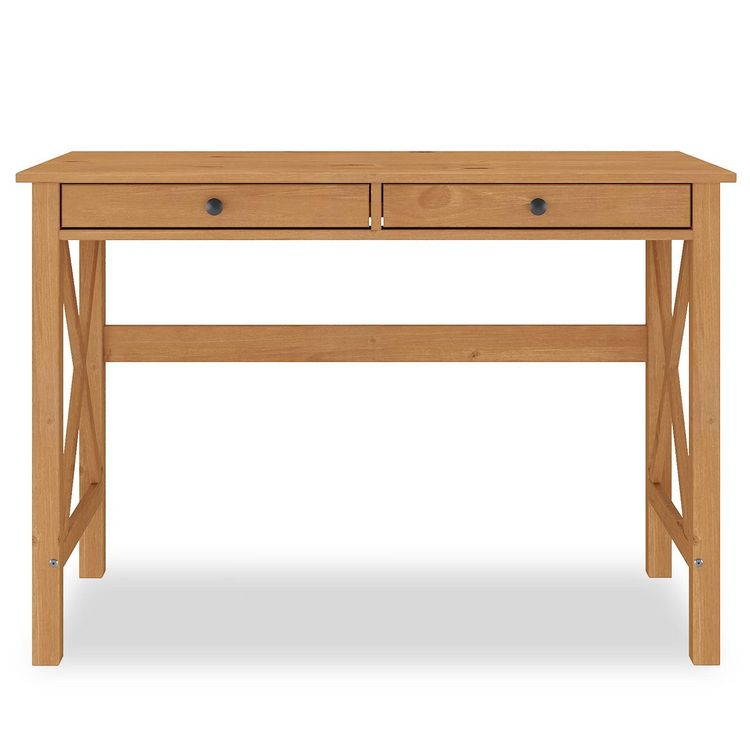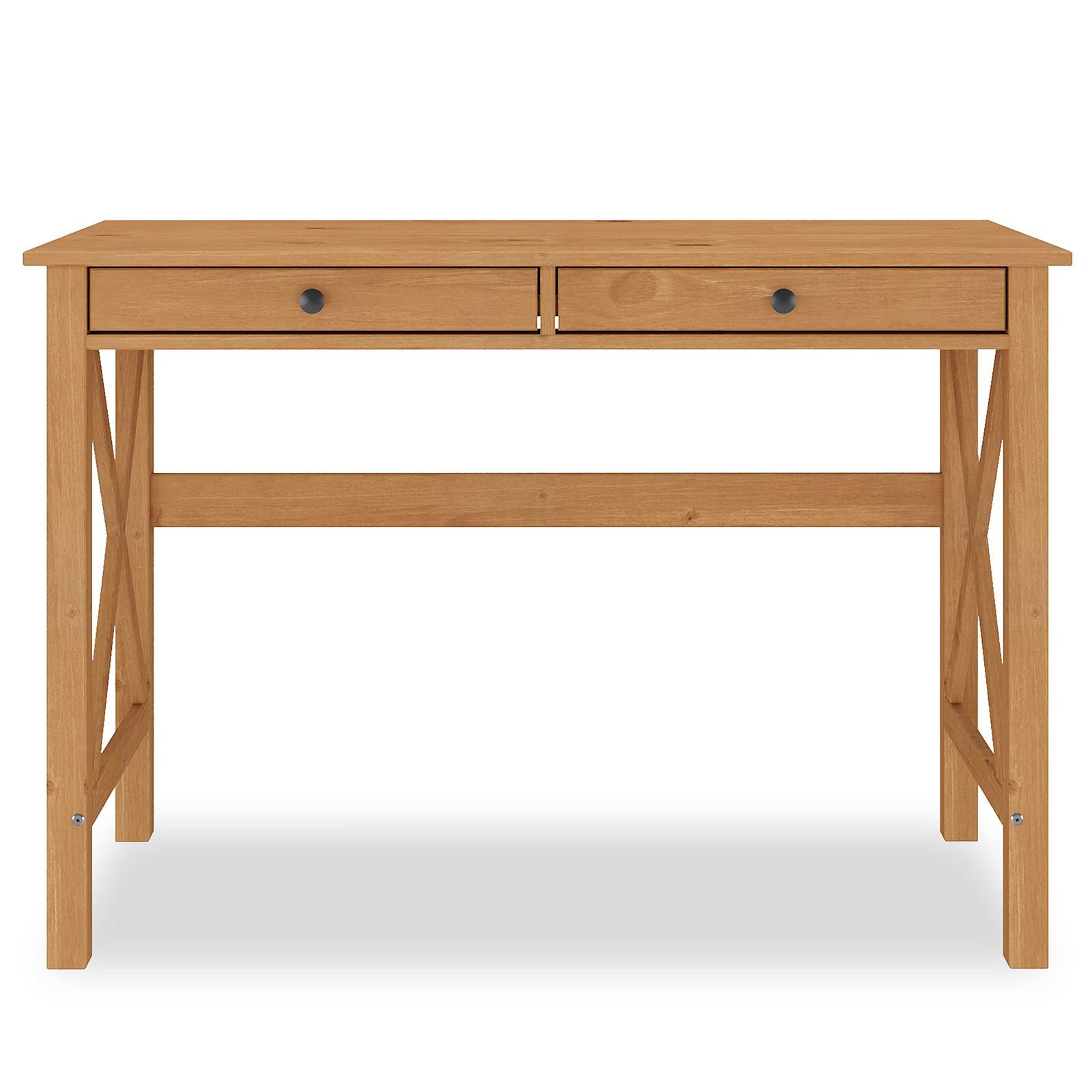 Bureau en bois AdrianFonctionnel et élégant, ce meuble compact s'intègre facilement dans les petits espaces. Sa conception en pin massif lui assure robustesse et longévité. Les deux tiroirs offrent un espace de rangement pratique. Les finitions naturelles et les détails soignés, comme les poignées n