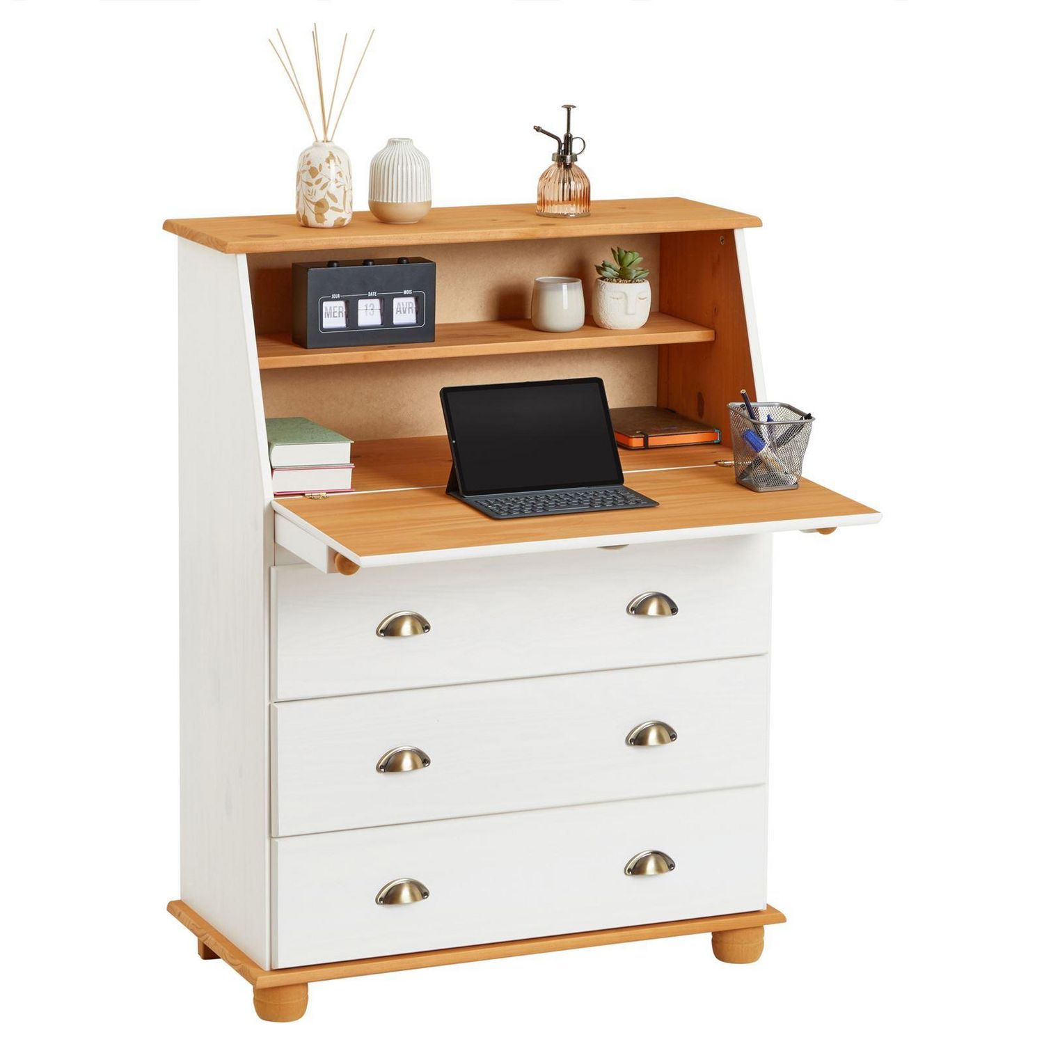 - Le secrétaire est fabriqué en pin massif, disponible dans plusieurs coloris.