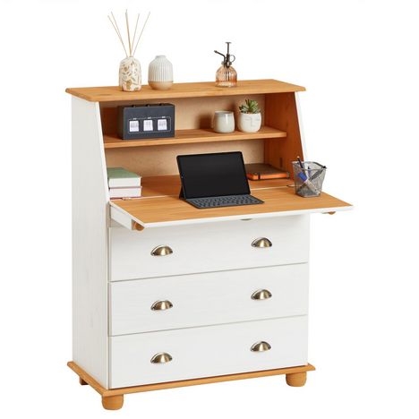 ... deviendra vite un élément essentiel de votre intérieur. Le plateau rabattable s'ouvre et se referme rapidement, et cache une étagère qui vous sera très utile pour y placer tout votre nécessaire de bureau. La partie basse est composée de 3 grands tiroirs qui vous permettront de ranger facilement toutes vos affaires afin de vous offrir un espace de travail bien organisé. Avec sa structure en pin massif et son style intemporel, ce bureau apportera une touche élégante et se mariera facilement avec le reste de votre mobilier.