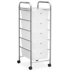 - La structure du chariot est en métal à la finition chromée et les tiroirs sont en plastique blanc transparent.