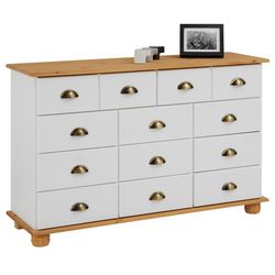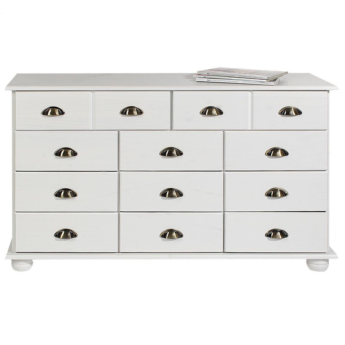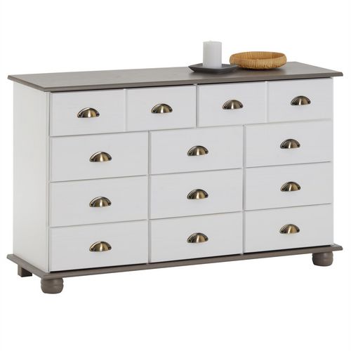 - La commode est fabriquée en pin massif, disponible dans 4 coloris : finition cirée, lasurée blanc, lasurée blanc et taupe, ou lasurée blanc et brun.