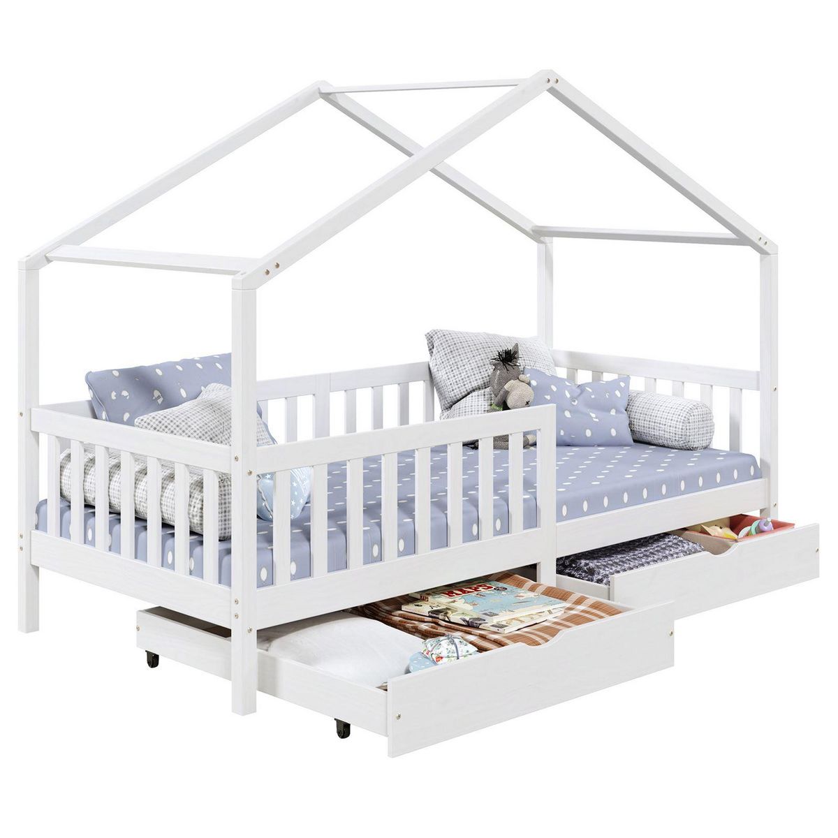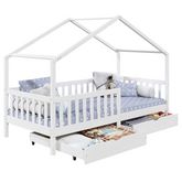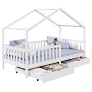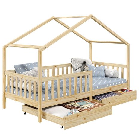 ... deviendra un espace de vie à part entière pour votre enfant qui pourra non seulement y dormir mais aussi y jouer ou lire. Les 2 grands tiroirs situés sous le lits, vous permettront d'y ranger tous les jouets et le linge de lit. Grâce aux barrières entourant le lit, votre enfant pourra dormir en toute sécurité. Sa structure en pin massif en forme de maisonnette se mariera parfaitement avec le reste de votre mobiler, et vous pourrez facilement y ajouter des objets de décoration !