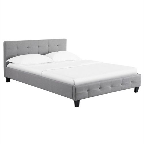 Lit double MATHIEU, 140 x 190 cm, capitonné avec sommier, revêtement en tissu gris