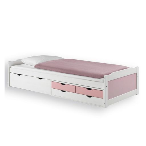 - Le cadre de lit est fabriqué en pin massif, disponibles en 2 coloris : lasuré blanc et lasuré blanc et rose.