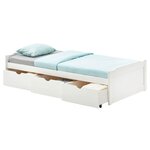 ... sera parfait même dans les petits espaces. Grâce à ces 3 grands tiroirs de rangement situés sous le lit, vous gagnerez un maximum de place et vous pourrez facilement mettre de l'ordre dans votre chambre ou celle de votre enfant. Sa structure en pin massif le rend à la fois robuste et solide, et vous permettra d'apporter une touche épurée et naturelle à votre intérieur.