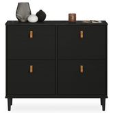 ... est composé de 4 compartiments à chaussures, chacun avec 2 étagères, offrant ainsi une capacité totale d'environ 16 paires de chaussures. Le design épuré s'inspirant du style scandinave de ce meuble à chaussures apporte une touche de modernité et de simplicité à votre intérieur. Les poignées en cuir ajoutent un détail de sophistication bienvenu et le plateau peut être utilisé pour poser de la décoration, vous permettant de personnaliser un peu plus votre espace. Idéal dans une entrée ou dans un chambre, ce meuble sera votre meilleur allié pour ne plus laisser traîner vos chaussures.