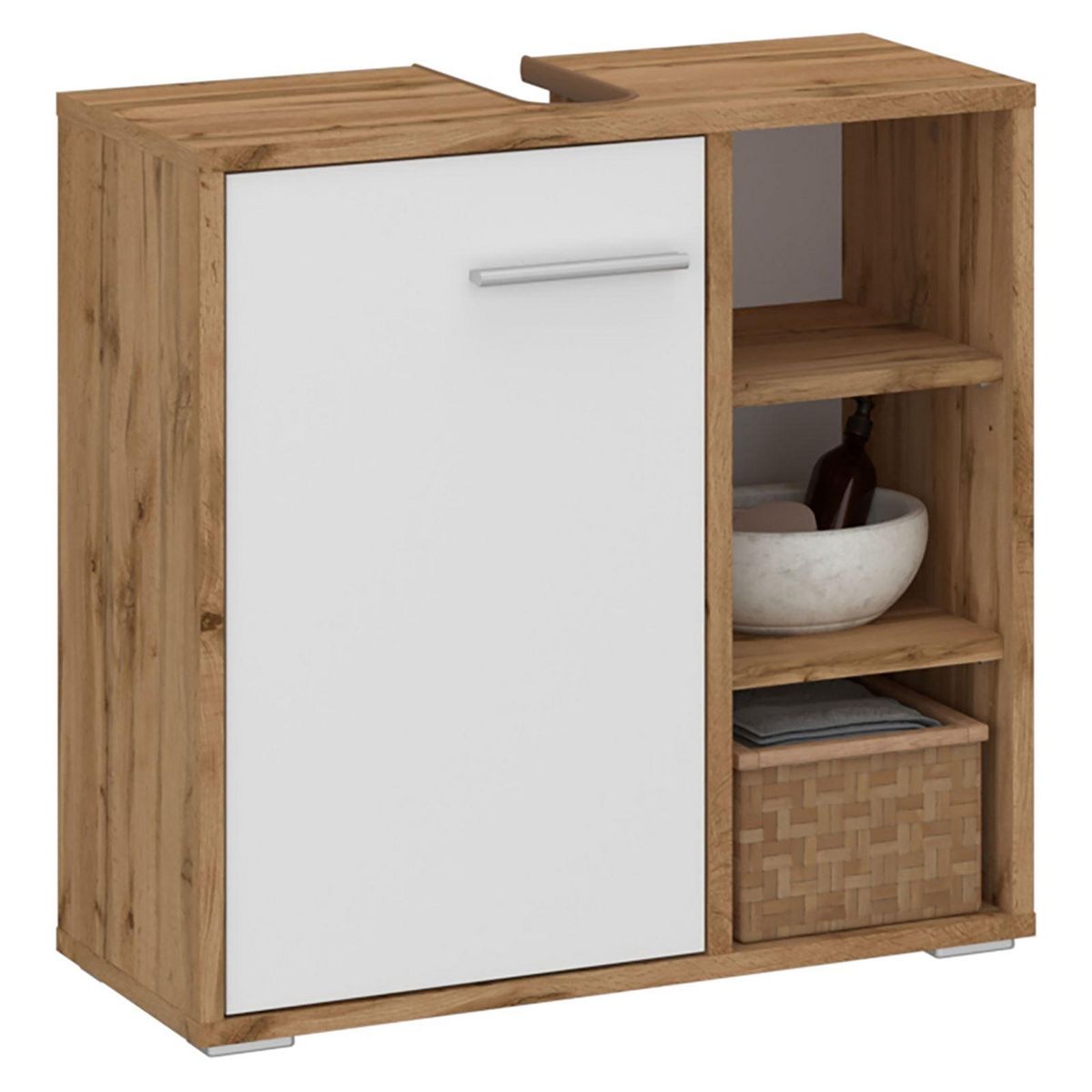 Meuble sous lavabo NISTOS avec 1 porte et 3 étagères couleur chêne wotan et blanc