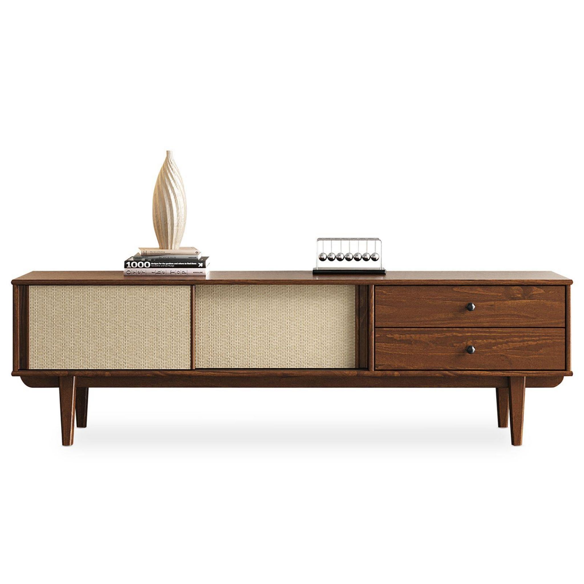 Meuble TV SimonaAjoutez une touche rétro et naturelle à votre intérieur avec ce buffet bas en bois massif et rotin tressé. Avec ses deux tiroirs spacieux et ses deux portes coulissantes, il offre une solution de rangement élégante et fonctionnelle. Sa conception basse en fait un meuble TV parfait po