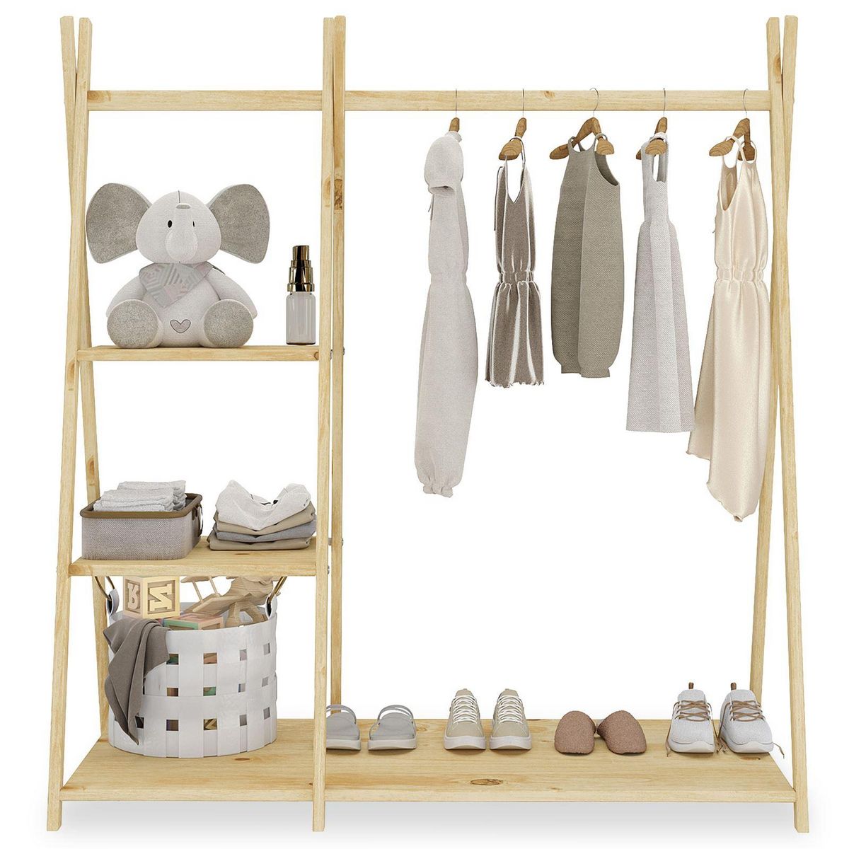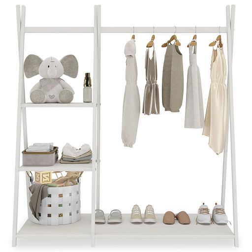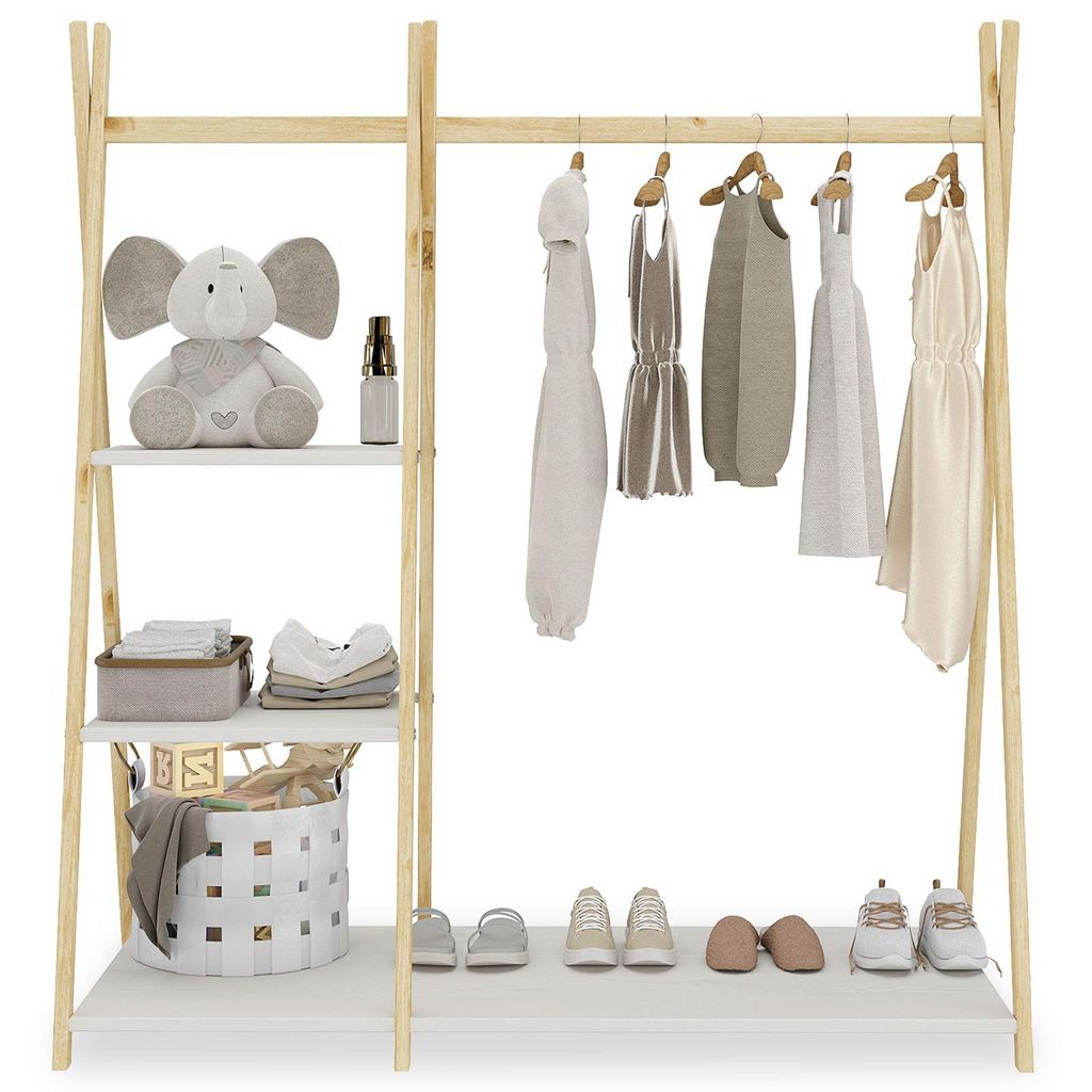 Idéale pour ranger les vêtements et accessoires de votre enfant, cette garde-robe compacte offre un design naturel et une grande fonctionnalité. Avec trois étagères et une barre penderie, elle permet une organisation optimale dans les petits espaces. Fabriquée en pin massif, elle garantit durabilité et charme intemporel.