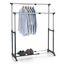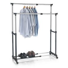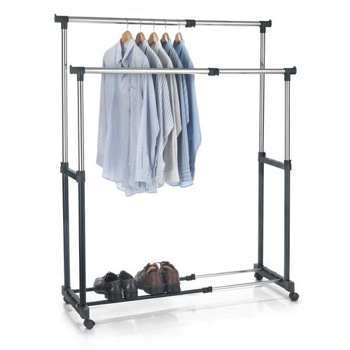 ... est idéal comme accessoire complémentaire pour le rangement de vos vêtements. Vous pouvez ainsi profiter de 2 tringles réglables en hauteur indépendamment l'une de l'autre, et agrandir ou réduire en longueur cette penderie selon l'espace disponible dans la pièce. Même quelques chaussures peuvent être stockées sur les barres du bas. Cette penderie est le compagnon parfait dans votre chambre, votre dressing ou votre entrée, très facile à déplacer avec ses roulettes.