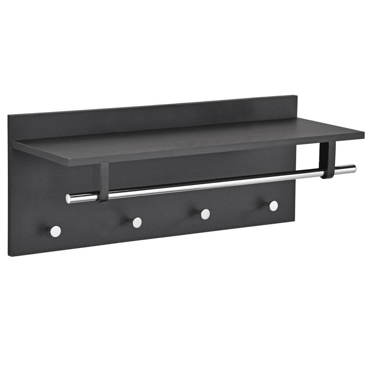 ... est un accessoire à la fois fonctionnel et très décoratif avec ses patères en métal chromé, fixées sur un panneau en bois au design moderne. Il conviendra parfaitement dans les petits ou les grands espaces, que ce soit dans une entrée ou un couloir. Cette penderie murale vous offre ainsi différentes possibilités de rangement : vous pourrez y accrocher vos manteaux, vestes, écharpes ou sacs à main grâce à ses 4 crochets, ainsi que des cintres sur la tringle, mais aussi déposer sur son étagère tous vos objets du quotidien, comme vos clés ou vos écouteurs, ou même de la déco. En plus d'habiller élégamment votre mur, ce meuble de rangement s'accordera facilement avec le reste de votre mobilier.