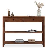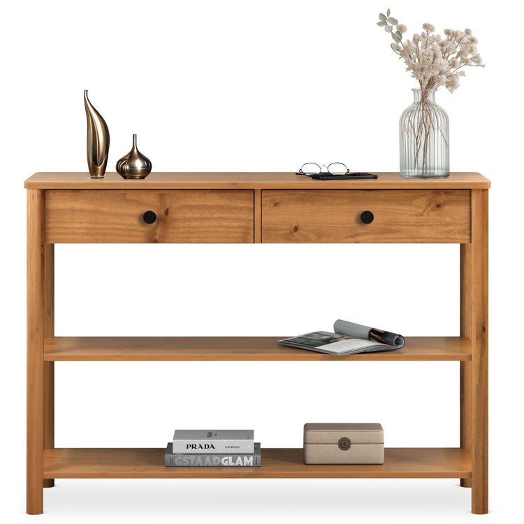 Apportez une touche naturelle et chaleureuse à votre intérieur avec cette console en bois de pin massif. Dotée de deux tiroirs pratiques et de deux étagères, elle offre un espace de rangement idéal pour vos objets décoratifs, livres ou accessoires du quotidien. Son design sobre et intemporel permet de l'intégrer facilement dans une entrée, un salon ou une chambre.