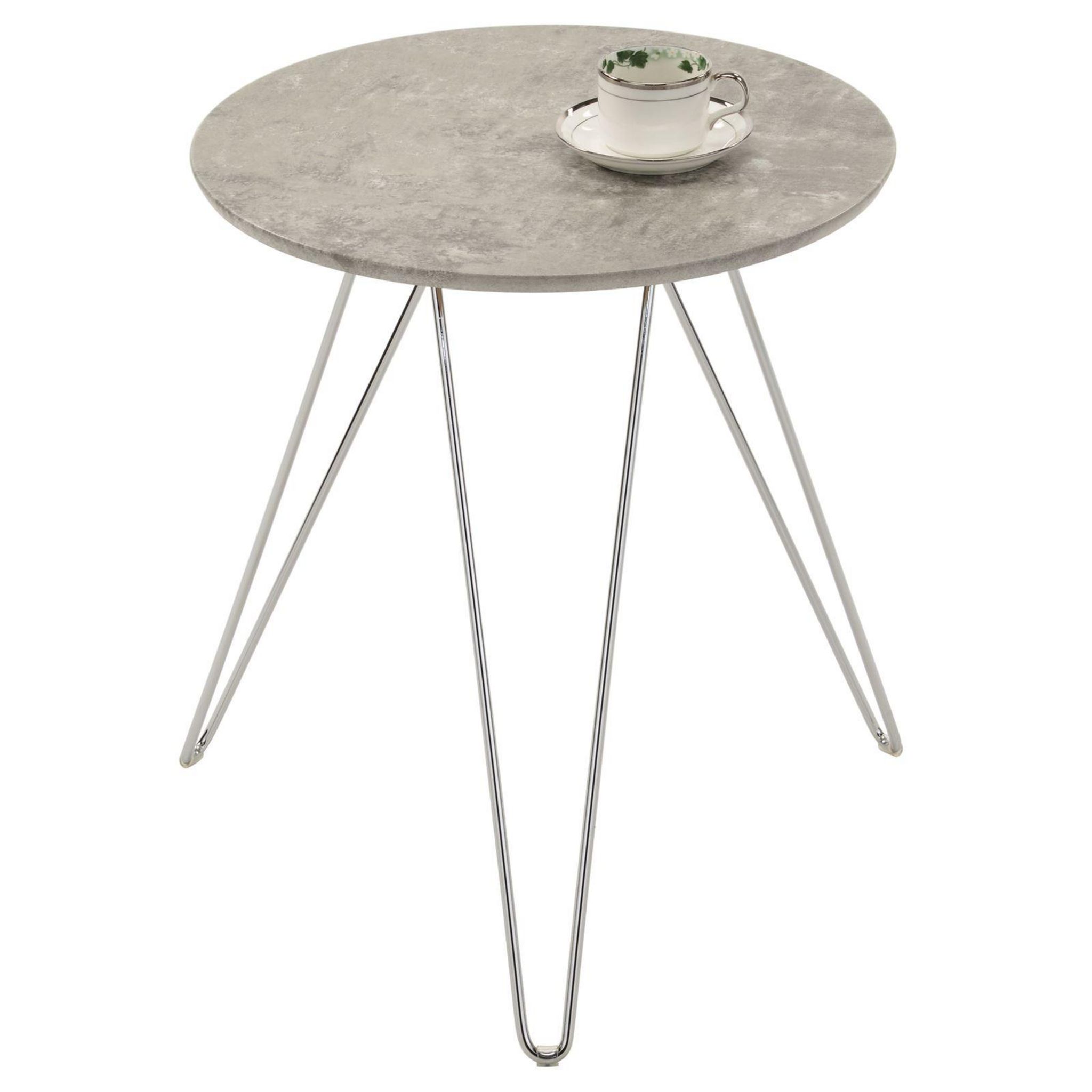 Table d'appoint BENNO, avec pieds en épingle métal chromé et décor béton gris