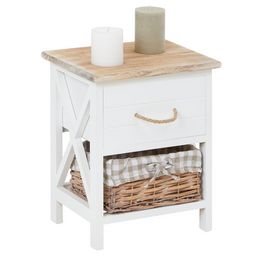 ... ne passera pas inaperçue avec son style shabby chic dans votre chambre à coucher. Le style champêtre et rustique de ce chevet est souligné par la poignée du tiroir en sisal et le panier en osier assorti, avec sa doublure en tissu à carreaux de style Vichy. Son tiroir et la corbeille vous offrent suffisamment d'espace de stockage pour ranger vos affaires personnelles à portée de main, et vous pourrez placer votre lampe de chevet, réveil et livres sur le plateau supérieur au rendu naturel. Lasuré en blanc mat, ce meuble en bois s'accordera parfaitement avec le reste de votre mobilier.