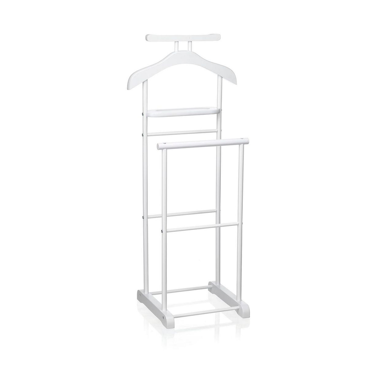 - Le valet est constitué d'élements en panneaux de fibres de bois de moyenne densité de coloris blanc mat et sa structure est en métal laqué blanc également.