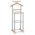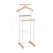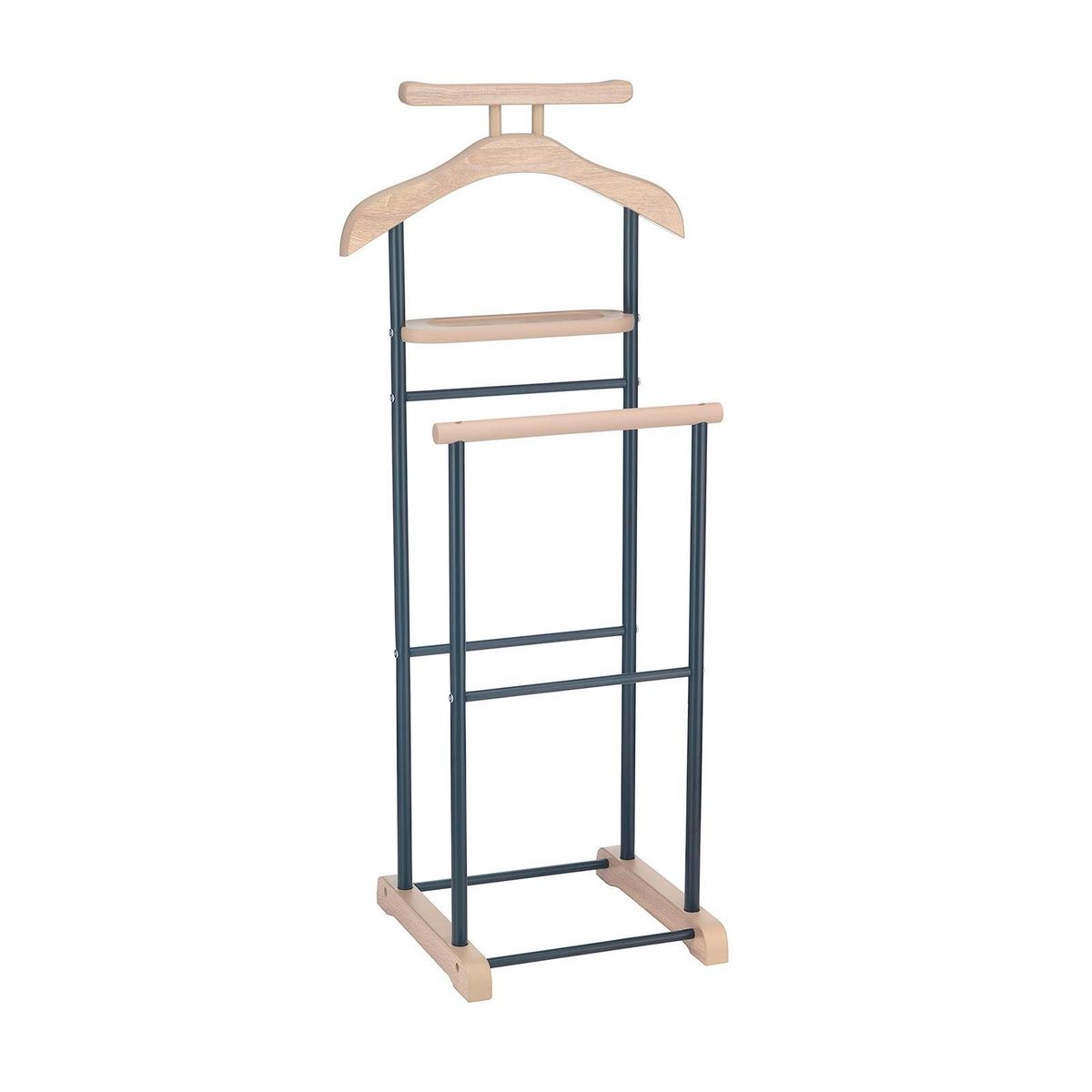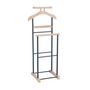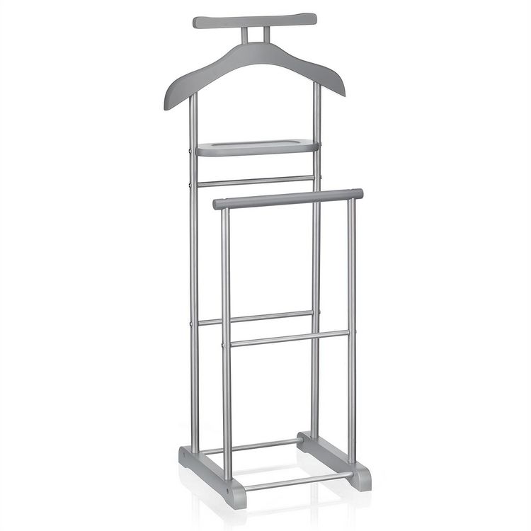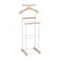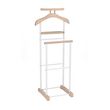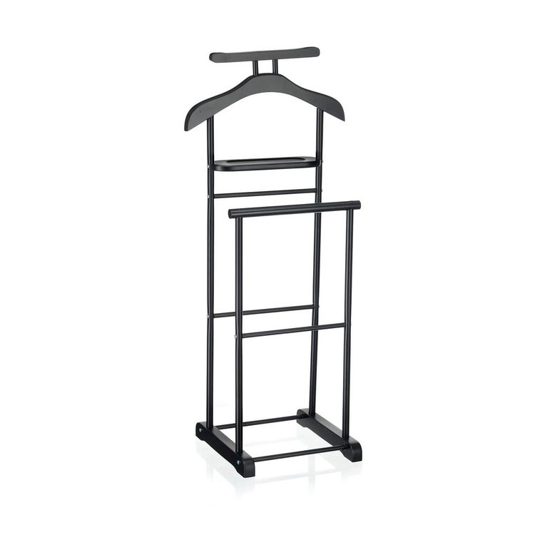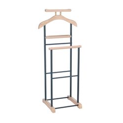 - Le valet est constitué d'élements en panneaux de fibres de bois de moyenne densité et sa structure est en métal laqué, disponible dans plusieurs coloris : noir/laqué noir, blanc/ laqué blanc, gris/laqué argenté, décor chêne sonoma/ laqué argenté ou couleur hêtre/ laqué argenté.