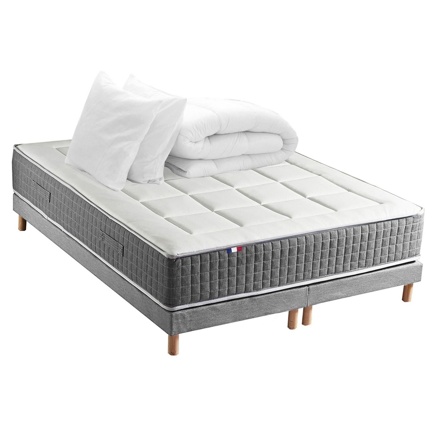 Ensemble Matelas Ressort 7 zones H.28cm + Sommier + couette + oreillers Fabriqué en France MAX