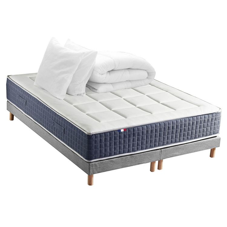 Offrez-vous des nuits sereines avec le pack literie king style, composé d'un matelas à ressorts ensachés, d'un sommier déco et d'une couette avec oreillers, le tout fabriqué en France.