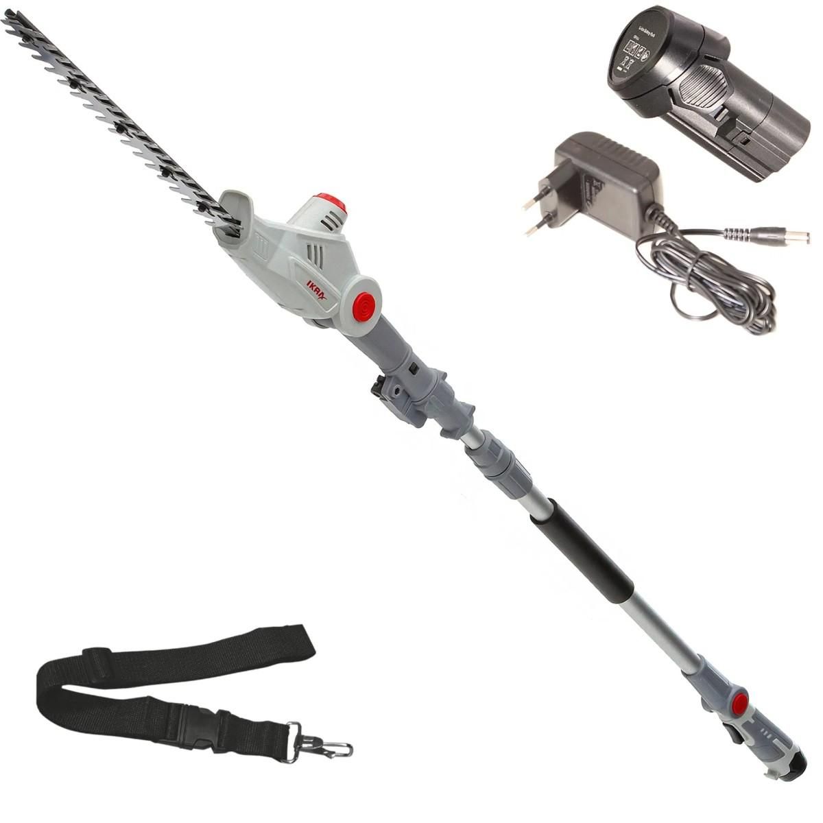 Taille Haie sur perche télescopique 12V - Lame de 41cm -Batterie Lithium 2,5Ah - Chargeur 12V - Sangle d'épaule IKRA