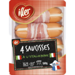 saucisse cuite supérieure 71,5% (viande de porc, eau, gras de porc, sel, poudre de tomate 0,8%, sirop de glucose, acidifiants : lactate de potassium, acétates de sodium, acide citrique ; dextrose, stabilisant : citrates de sodium ; épices, arômes naturels, arômes, antioxydant : ascorbate de sodium ; conservateur : nitrite de sodium), FROMAGE fondu 10,5% [FROMAGES (dont MOZZARELLE 3,6%), BEURRE, eau, protéines de LAIT, sels émulsifiants : citrates de sodium, polyphosphates ; lactosérum, sel, gélifiant : carraghénanes], poitrine fumée 10,5% (poitrine de porc 9%, sel, conservateurs : lactate de potassium, nitrite de sodium ; antioxydant : érythorbate de sodium ; dextrose)