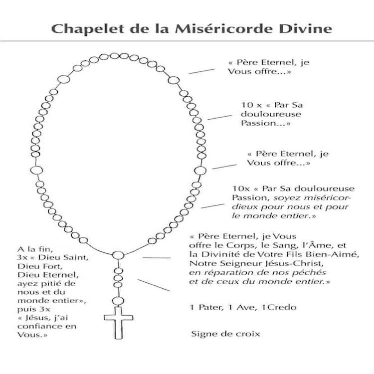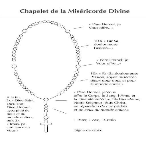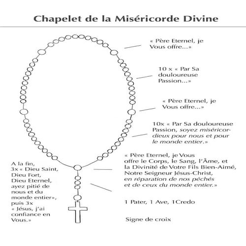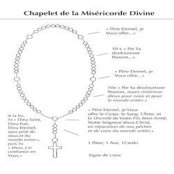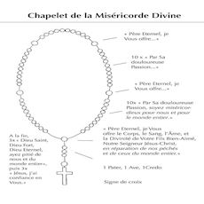 Notre Seigneur Jésus Christ dicta à soeur Faustine Kowalska le chapelet à la Miséricorde Divine, à Vilnius les 13 et 14 septembre 1935, comme prière destinée à fléchir et apaiser la colère de Dieu, et à expier nos péchés, ceux de nos proches et du monde entier. Oh ! Quelles grandes grâces J'accorderai aux âmes qui diront ce chapelet (...) Inscris ces mots, ma fille, parle au monde de ma miséricorde, que l'humanité entière apprenne à connaître Mon insondable miséricorde. C'est un signe pour les derniers temps, après viendra le jour de la justice. (Petit Journal, no 848) Récite constamment le chapelet que Je t'ai enseigné. Quiconque le dira, accédera à une grande miséricorde à l'heure de sa mort. Les prêtres le recommanderont aux pécheurs comme ultime planche de salut, même le pécheur le plus endurci, s'il récite ce chapelet une seule fois, obtiendra la grâce de Mon infinie miséricorde. (Petit Journal, no 687) Si l'on récite ce chapelet auprès d'un agonisant, Je me tiendrai entre le Père et l'âme agonisante, non pas en tant que Juge juste, mais comme Sauveur miséricordieux. (Petit Journal, no 1541)