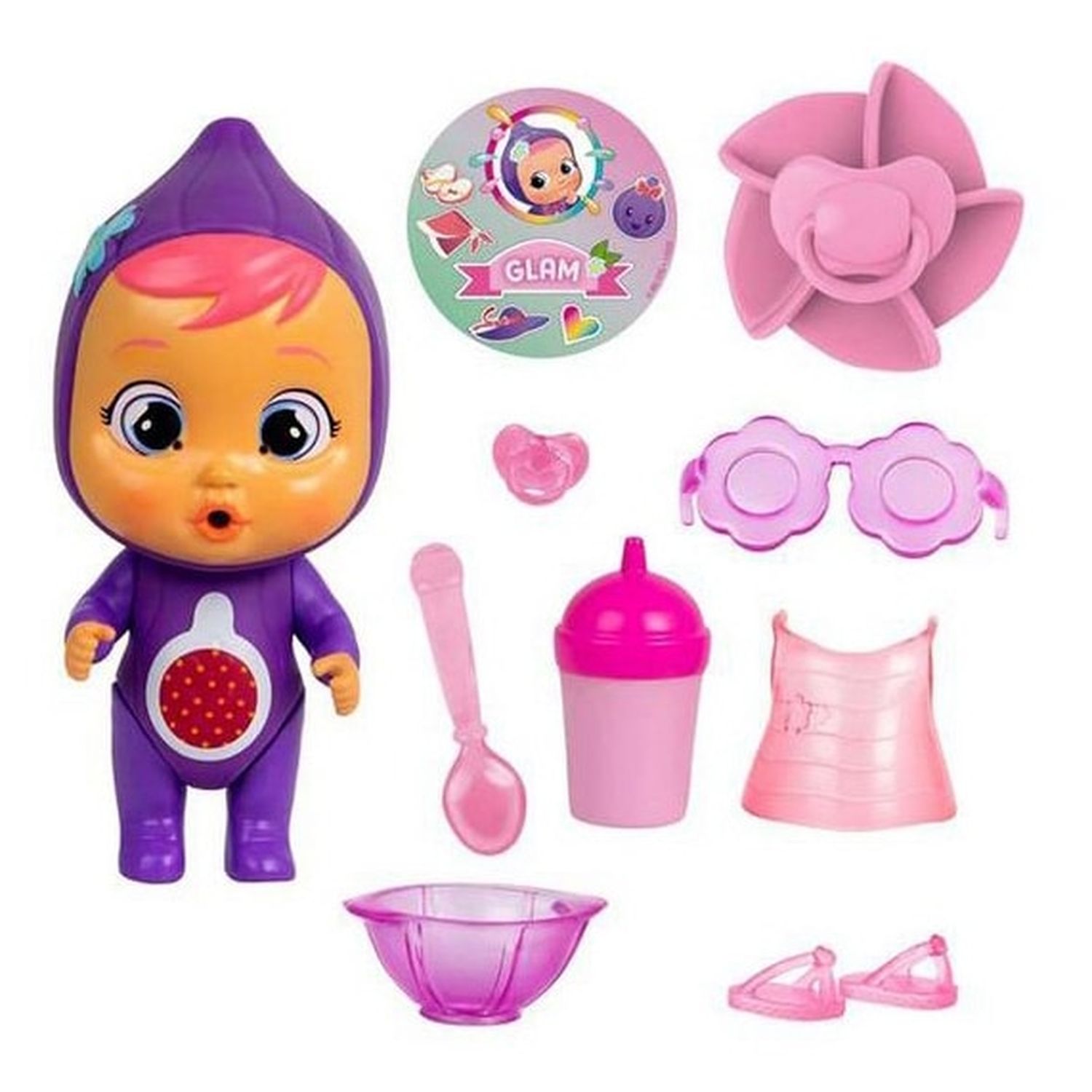 - 1 mini-poupon articulé qui pleure de vraies larmes lorsque vous lui appuyez sur le ventre.