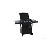 Barbcue à gaz butane ou propane IMOR® permettant un double mode de cuisson (sur la grille et sur la plancha). Chariot à roulettes équipé de deux tablettes latérales. Produit facile à monter et à utiliser.