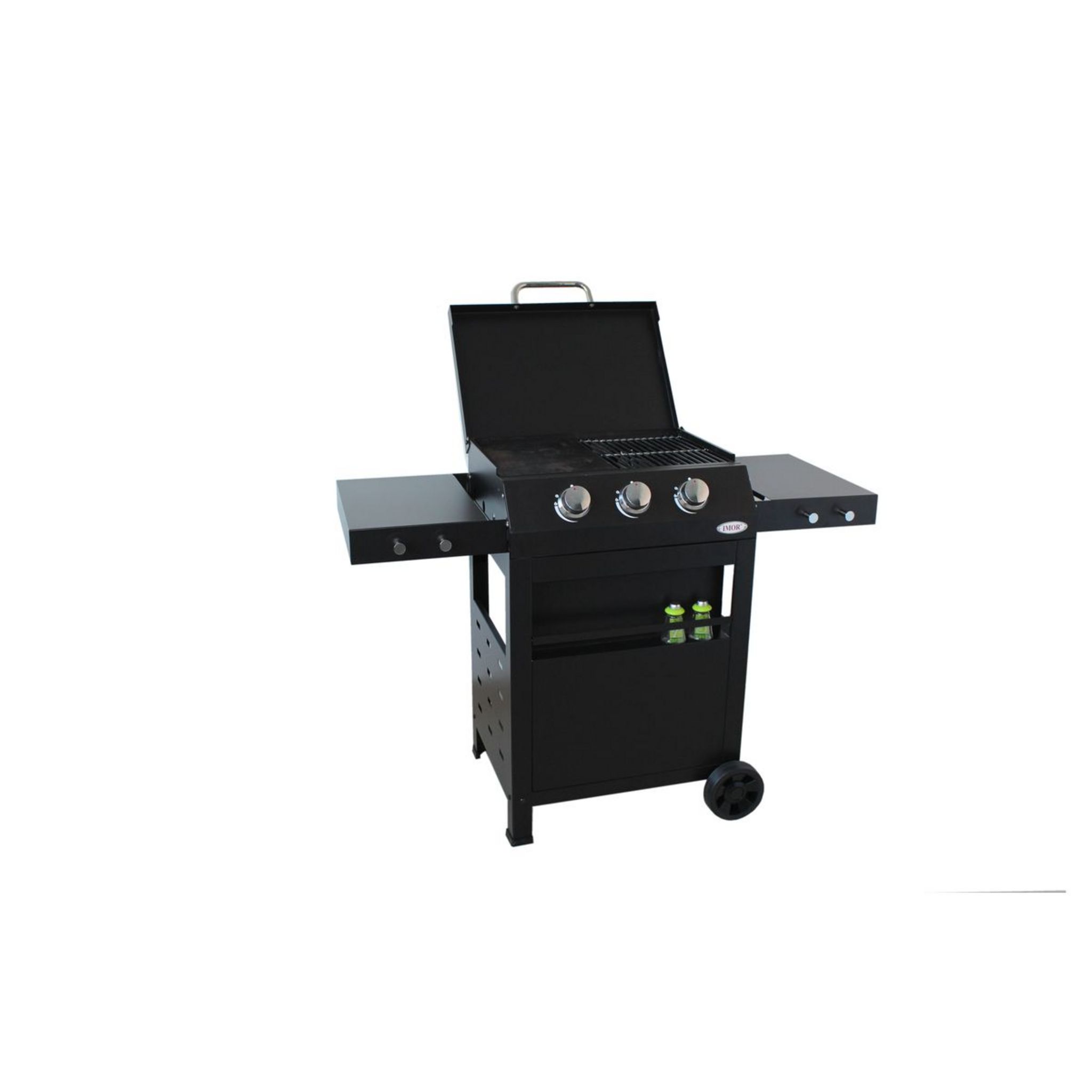 Ce barbecue au gaz IMOR® fonctionnant au gaz butane ou au gaz propane en bouteilles pour un usage extérieur. Il est équipé de 3 brûleurs en acier inoxydable permettant une puissance de chauffe de 8,5 KW. Son foyer est composé d'une grille et d'une plancha. La plancha vous permettra de saisir légumes et poissons alors que la grille vous permettra de cuire vos viandes. Profitez d'une surface de cuisson totale 2250 cm²(2 parties de 30x37,5 cm). la plancha est en acier d'une épaisseur de 12 mm et la grille estéquipée de barreaux en acier de 5mm de grosseur. Ce barbecue IMOR® vous offrira un confort d'utilisation grâce à son système d'allumage piézoélectrique.
