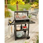 Le chariot à roulettes est équipé de deux tablettes latérales et d'une étagère basse. La crémaillère à manivelle pour un réglage de la hauteur de la grille. La grille en acier inoxydable en forme de 'V' pour une cuisson saine des aliments.