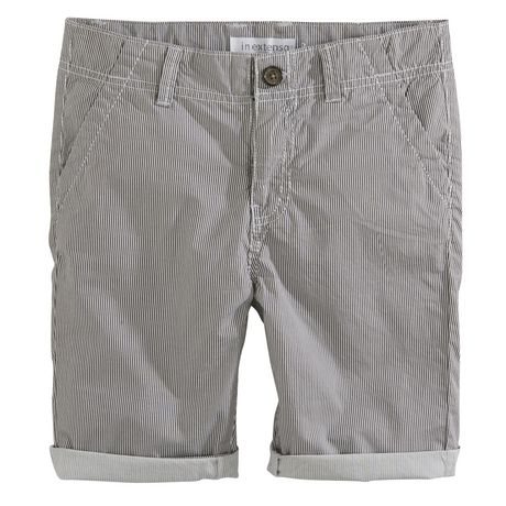 Allure classieuse au rendez-vous avec ce bermuda garçon à fines rayures ! Matière légère et agréable à porter. Taille ajustable de l'intérieur par élastique et boutons. Ouverture par bouton et zip. 2 poches sur le devant, 2 empiècements imitant les poches au dos. Jeu de surpiqûres. Ce bermuda
