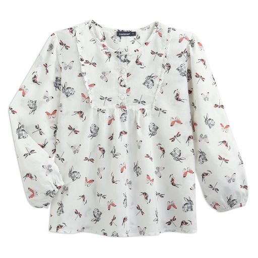 Allure élégante avec cette blouse fille, légère et agréable à porter. Manches longues. Col rond avec ouverture par patte boutonnée. Poignets élastiquées. Jeu de plis et volants sur le devant. Légères fronces aux épaules. Finitions élastiquées au milieu du dos. Cette blouse fille est facile d'e
