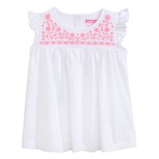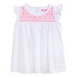 On aime la finition brodée de cette blouse fille. Maille agréable à porter 100% coton. Col rond, manches volantées. Broderie fantaisie fluo. Jeu de plis. Ouverture boutonnée en haut du dos. Pas d'étiquette dans le cou pour un meilleur confort. Base évasée. Cette blouse fille est lavable en machi