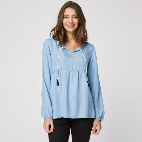 Très bohème cette blouse en lyocell avec son col rond et ses liens à l'encolure.