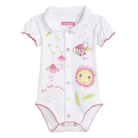 Ce body bébé fille se pare d'adorables motifs et de détails fantaisie, on craque ! Confectionné en coton. Col claudine. Manches courtes légèrement bouffantes et animées de petits volants. Ouverture complètement pressionnée sur le devant, entrejambe pressionné. Points picots fantaisie. Pas d'étiquette dans le cou pour le confort. Ce body bébé fille est lavable en machine à 40°.