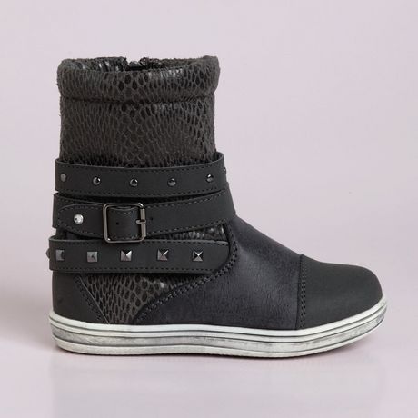 Ces boots fille au style tendance vont faire du bruit à la récré ! Dessus bi-matière avec un effet légèrement brillant. Zip sur le côté. Pattes fantaisie agrémentées de clous et de strass. Intérieur confortable en textile. Effet "usé" à la base. Ces boots fille ont des semelles élastomère antidérapa