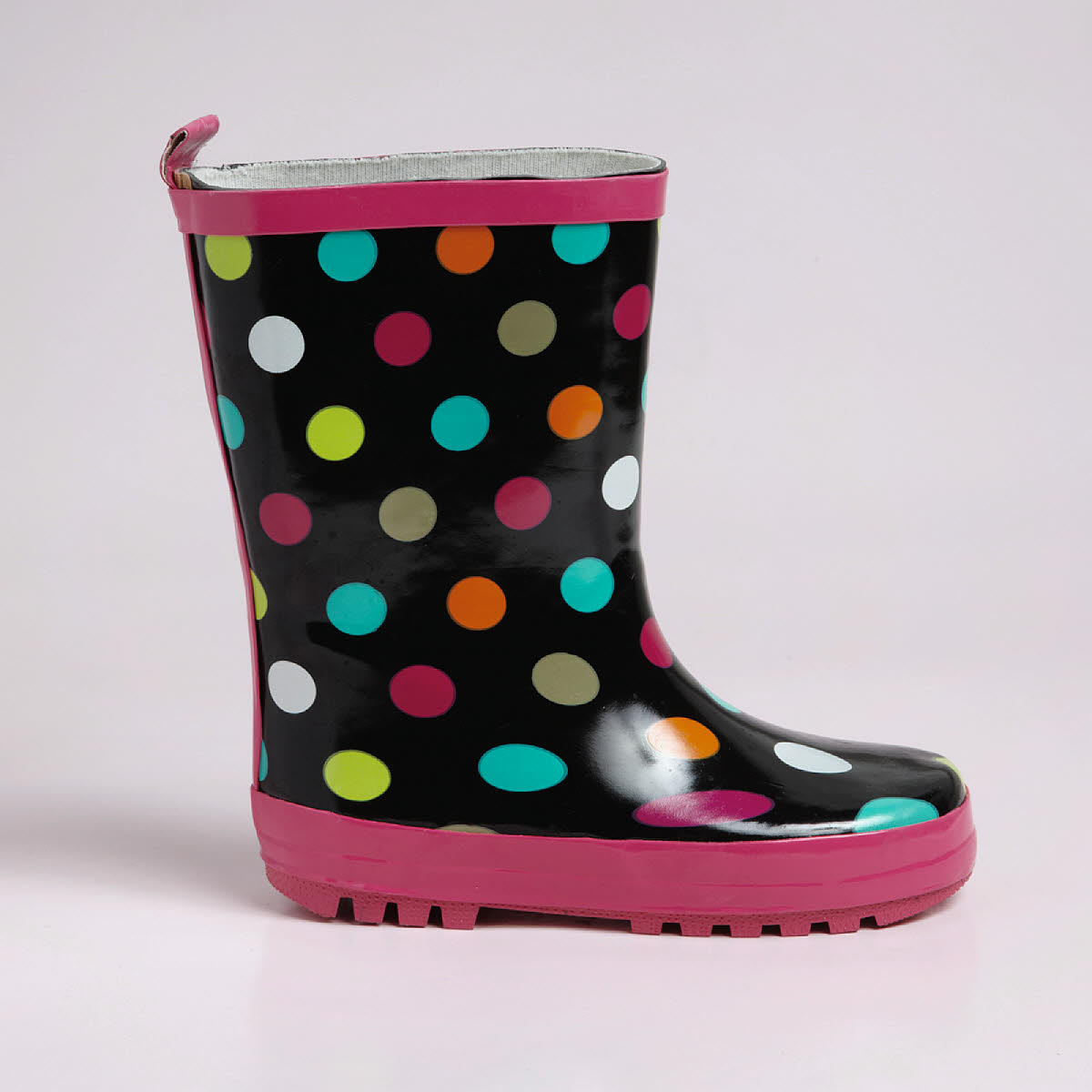 Ces bottes de pluie fille s'ornent de pois multicolores pour oublier la grisaille du ciel ! Tirette sur le haut de la tige pour les chausser facilement. Dessus brillant. Intérieur en textile pour le confort du pied. Ces bottes de pluie fantaisie ont des semelles crantées pour éviter de glisser !