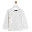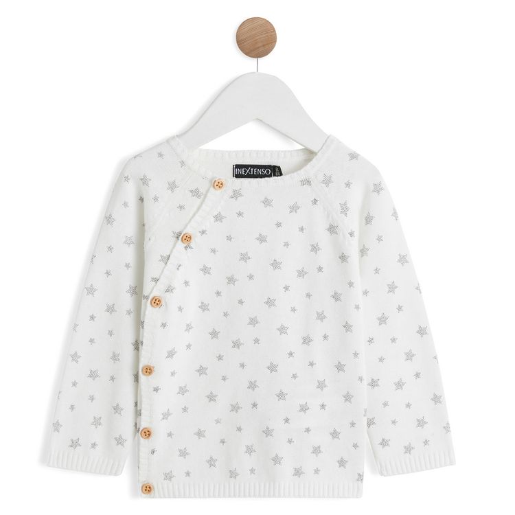 Ce joli pull boutonné forme brassière en maille coton est parfait pour composer des tenues élégantes et douillettes pour bébé. On craque pour le joli motif étoilé et les boutons effet bois sur fond écru.
