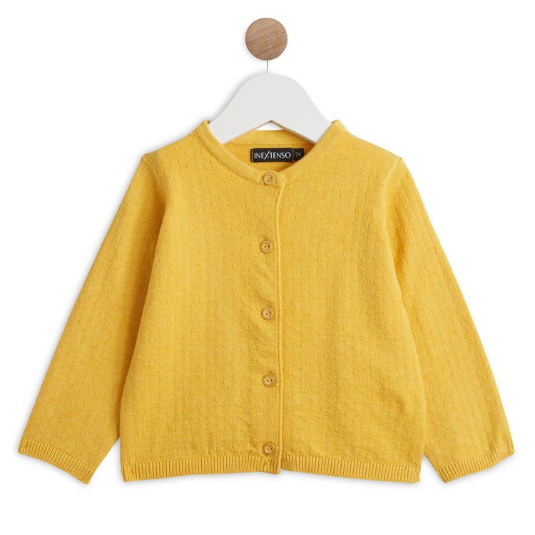 En maille fantaisie bien chaude, ce cardigan confectionné est parfait pour réchauffer les petites blouses et robes de bébé. Muni de manches longues, il se ferme avec 5 boutons ton sur ton placés devant. Avec finitions bord-côtes.