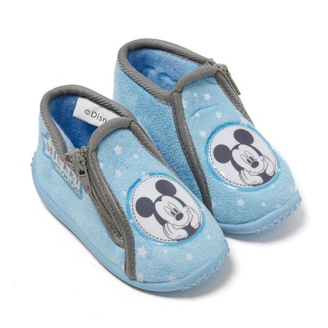 Posséder une paire de chaussons bébé confortables et doux pour la maison c'est indispensable ! Chaussons bébé Mickey. Chaussons bébé montants et bien emboîtants en textile. Dessus mi-uni, mi imprimé, avec badges Mickey appliqués. Pratique : ouverture zippée sur le côté. Intérieur confortabl