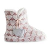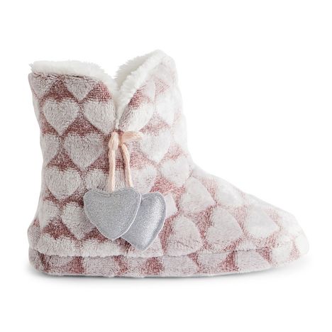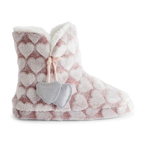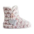 Ces chaussons forme boots sont un rêve de douceur : confectionnés en maille peluche moelleuse avec de jolis coeurs embossés, ils sont fourrés en sherpa bien chaud. La semelle extérieure est souple et possède un dessous antidérapant. On craque pour les liens avec deux gros coeurs argentés sur les côt