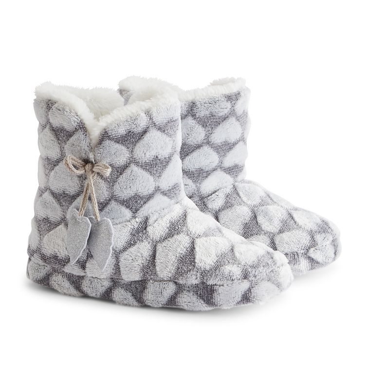 Ces chaussons forme boots sont un rêve de douceur : confectionnés en maille peluche moelleuse avec de jolis coeurs embossés, ils sont fourrés en sherpa bien chaud. La semelle extérieure est souple et possède un dessous antidérapant. On craque pour les liens avec deux gros coeurs argentés sur les côt