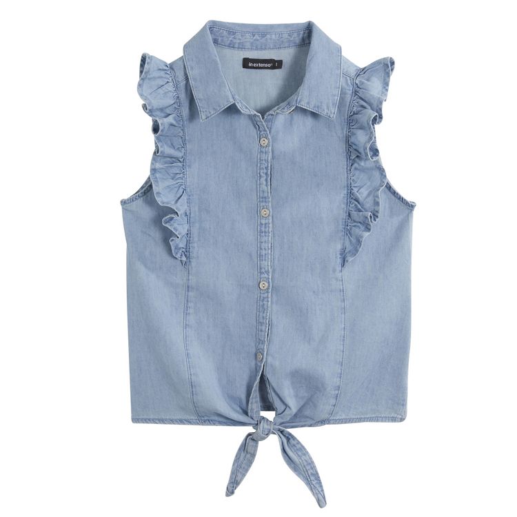 Cette chemise sans manches en jean se pare de détails féminins pour séduire les filles ! On aime : les volants fantaisie. La chemise en jean est réalisée en coton. Elle dispose d'une ouverture boutonnée et d'un nœud à la base. On note le jeu de découpes et le pli en haut du dos. Cette chem