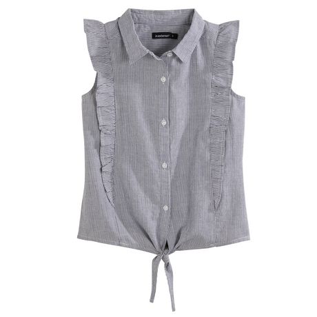 Cette chemise à fines rayures donne un look hyper tendance aux filles : elles adorent. Elle est légère et agréable à porter. On aime : les touches brillantes, les volants fantaisie sur le devant et au dos et le nœud à la base. Ouverture boutonnée. Cette chemise sans manches fille est faci