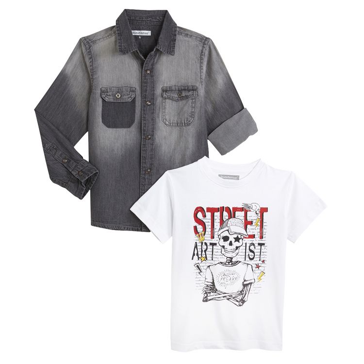 Allure décontractée pour nos garçons avec cet ensemble tee-shirt et chemise en jean ! Agréables à porter. 100% coton. Tee-shirt : col rond, manches courtes, imprimé sur le devant. Chemise en denim : aspect légèrement délavé, 1 poche à rabat, 1 rabat boutonné, ouverture pratique pressionnée, bas