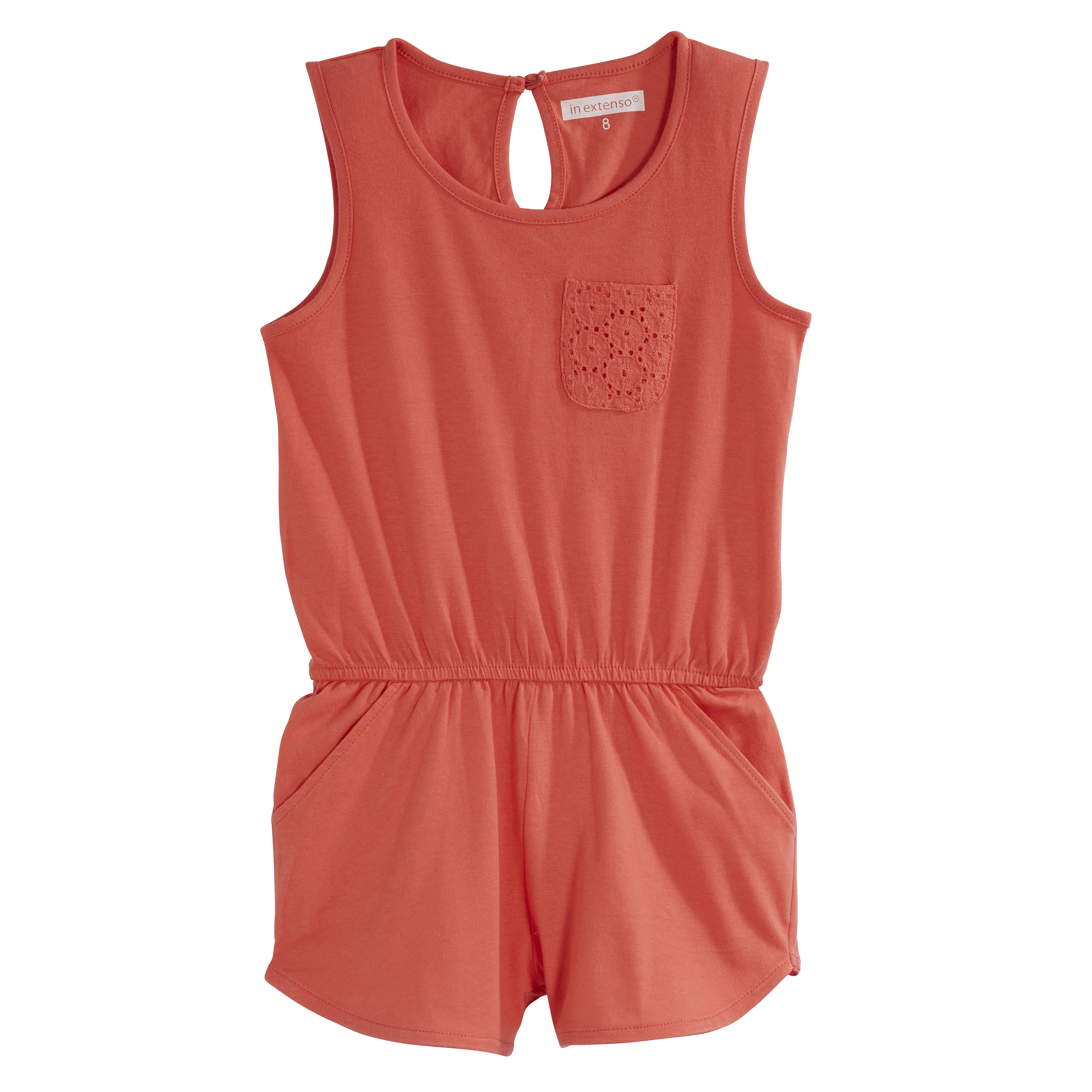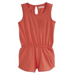 Ce combi-court se pare de détails fantaisie pour séduire les filles. On aime : la poche brodée sur la poitrine et l'ouverture en forme de goutte en haut du dos. Le combicourt fille est élastiquée à la taille. On note les poches. Il est facile d'entretien.