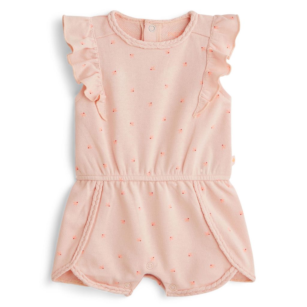 Style girly et romantique pour bébé fille avec cette combinaison en molleton léger ! Animée d'un délicat imprimé fantaisie, elle se démarque par ses manches volantées ainsi que ses finitions tressées ton sur ton. Afin de simplifier l'habillage, cette combinaison possède une ouverture pressionnée au dos et à l'entrejambe.